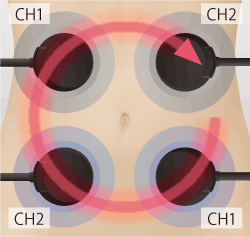 3対の異なる高い周波数の電流が生体内部で干渉し、立体的で複雑な電流のうねりを発生させます。
